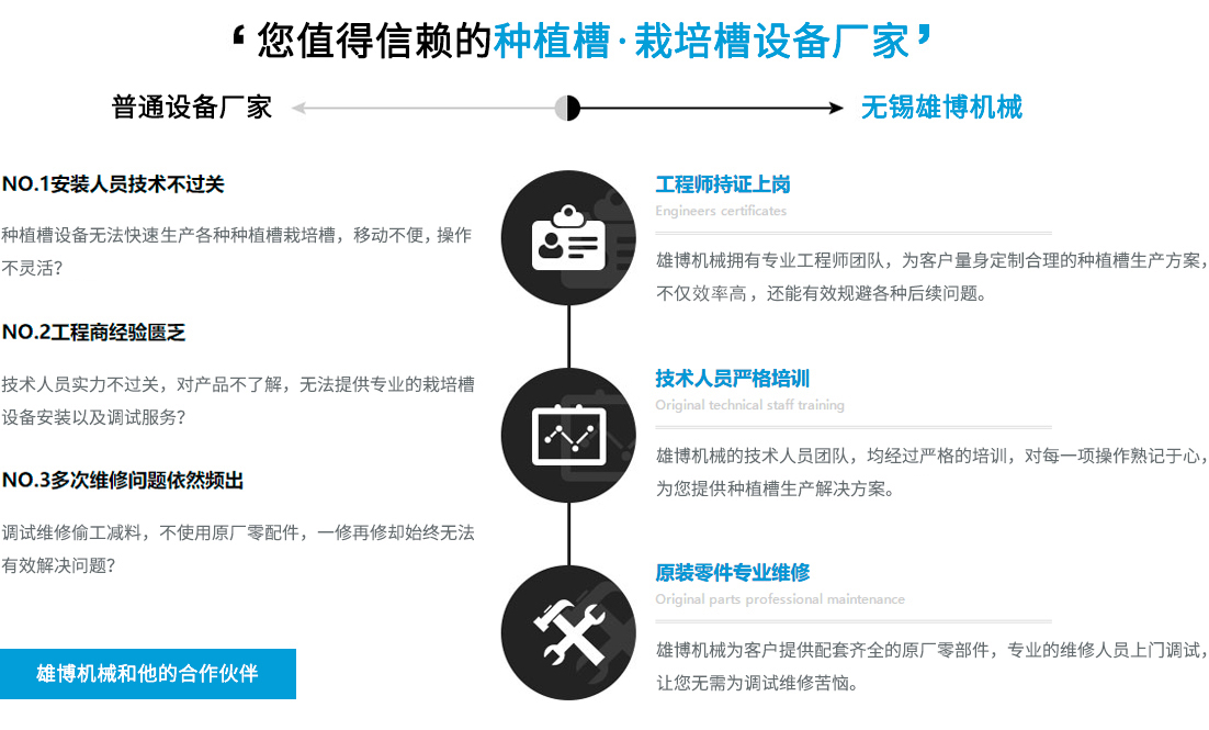 您在選擇雄博產品的同時,也選擇無微不至的終身服務??筛鶕煌蛻魧嶋H需求進行種植槽設備,栽培槽設備等的特殊工藝設計制造專業一對一售前/售后/技術咨詢指導,享受更貼心/放心的設備使用體驗。